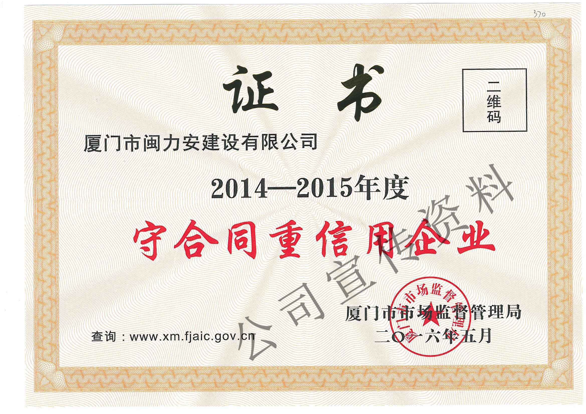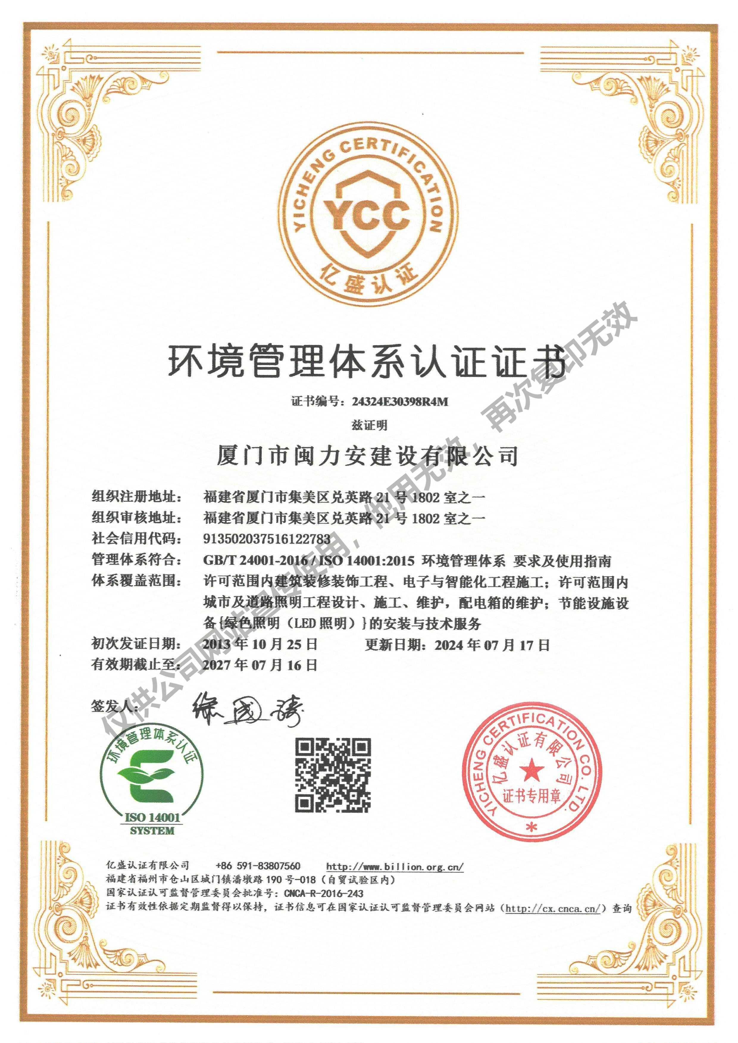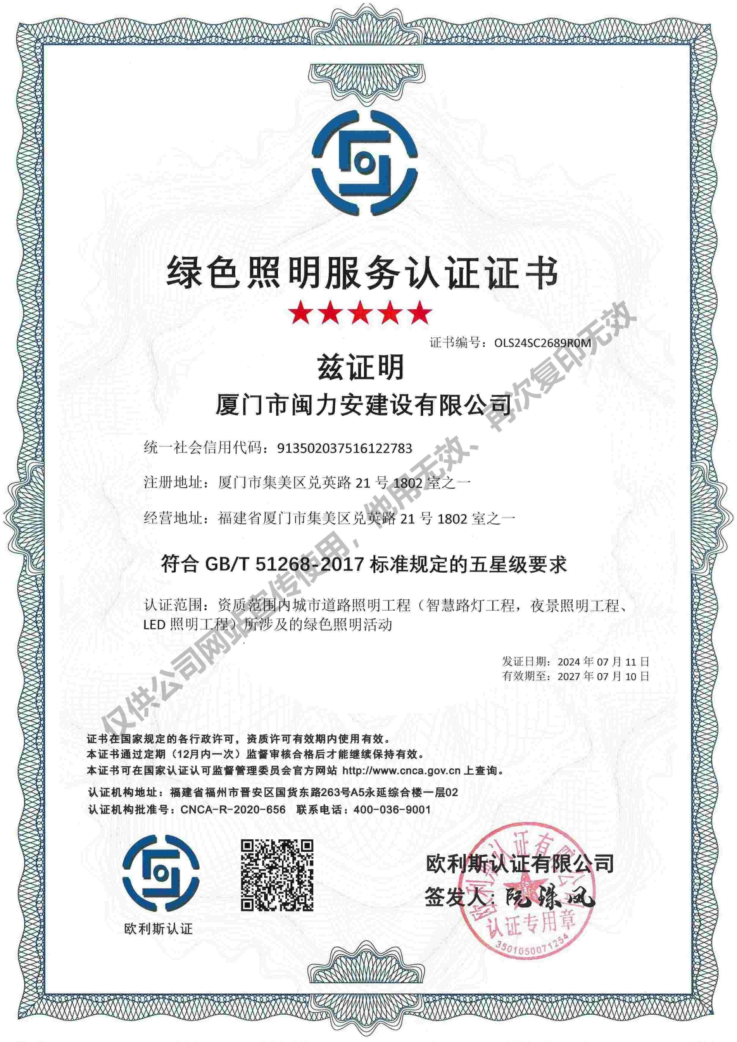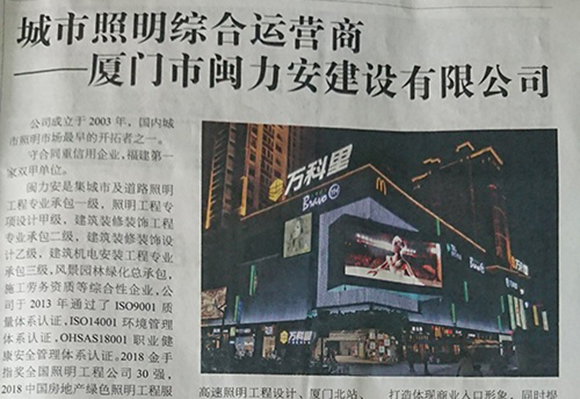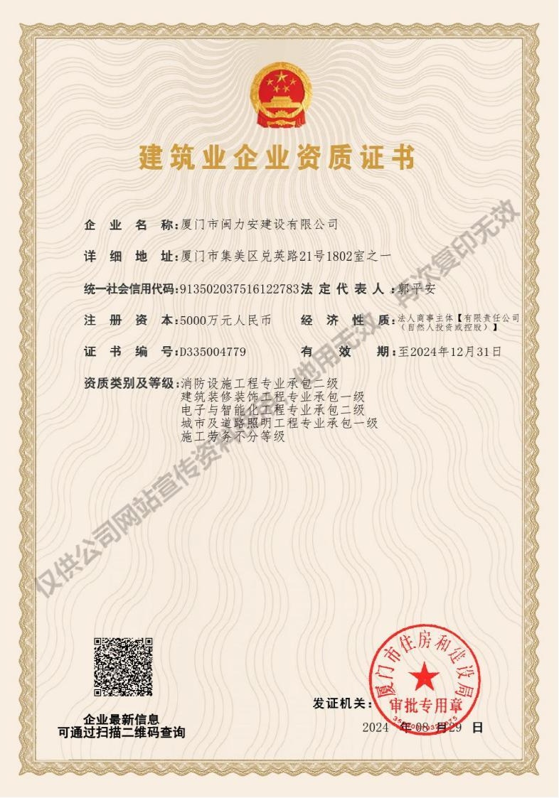 廈門市閩力安建設(shè)有限公司成立于2003年,公司取得市政公用工程施工總承包貳級、建筑裝修裝飾工程專業(yè)承包壹級、城市及道路照明工程專業(yè)承包壹級、電子與智能化工程專業(yè)承包貳級、消防設(shè)施工程專業(yè)承包貳級、電力工程施工總承包叁級、建筑機(jī)電安裝工程專業(yè)承包叁級、輸變電工程專業(yè)承包叁級、環(huán)保工程專業(yè)承包叁級、照明工程設(shè)計專項甲級、建筑裝飾工程設(shè)計乙級、施工勞務(wù)等資質(zhì)的綜合型企業(yè),公司于2013年通過了ISO9001質(zhì)量體系認(rèn)證,ISO14001環(huán)境管理體系認(rèn)證,OHSAS18001職業(yè)健康安全管理體系認(rèn)證。