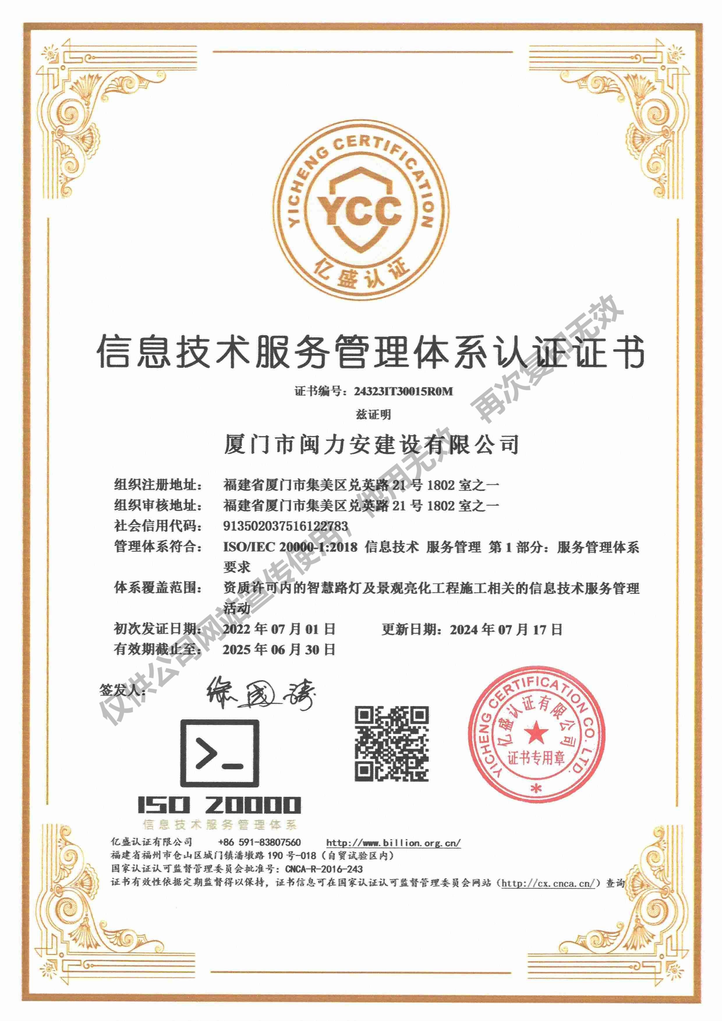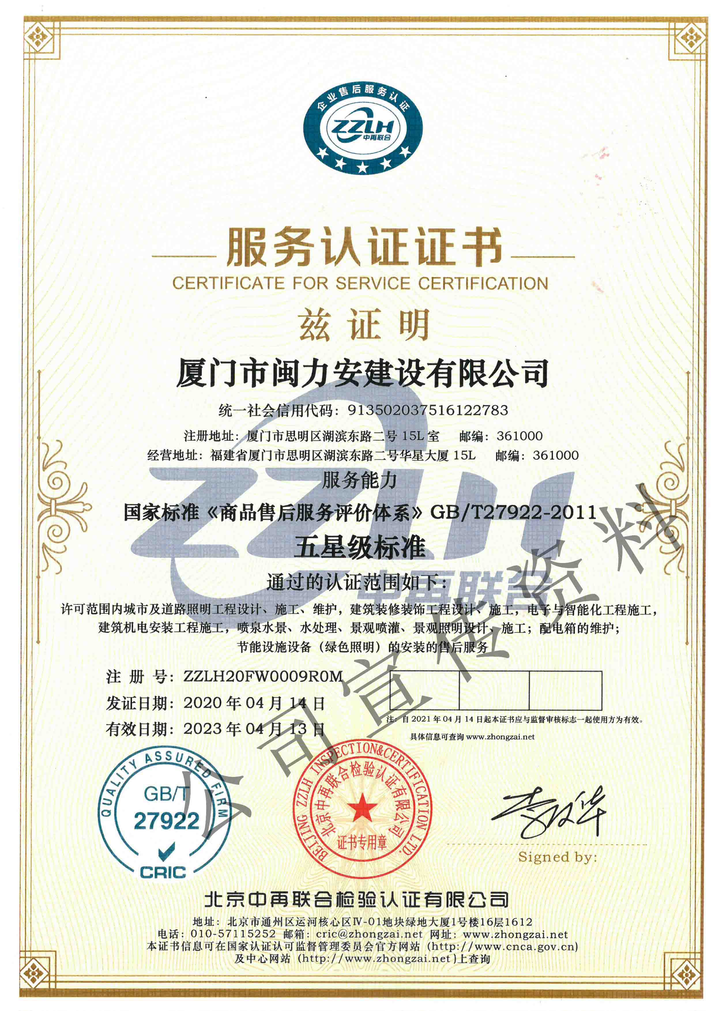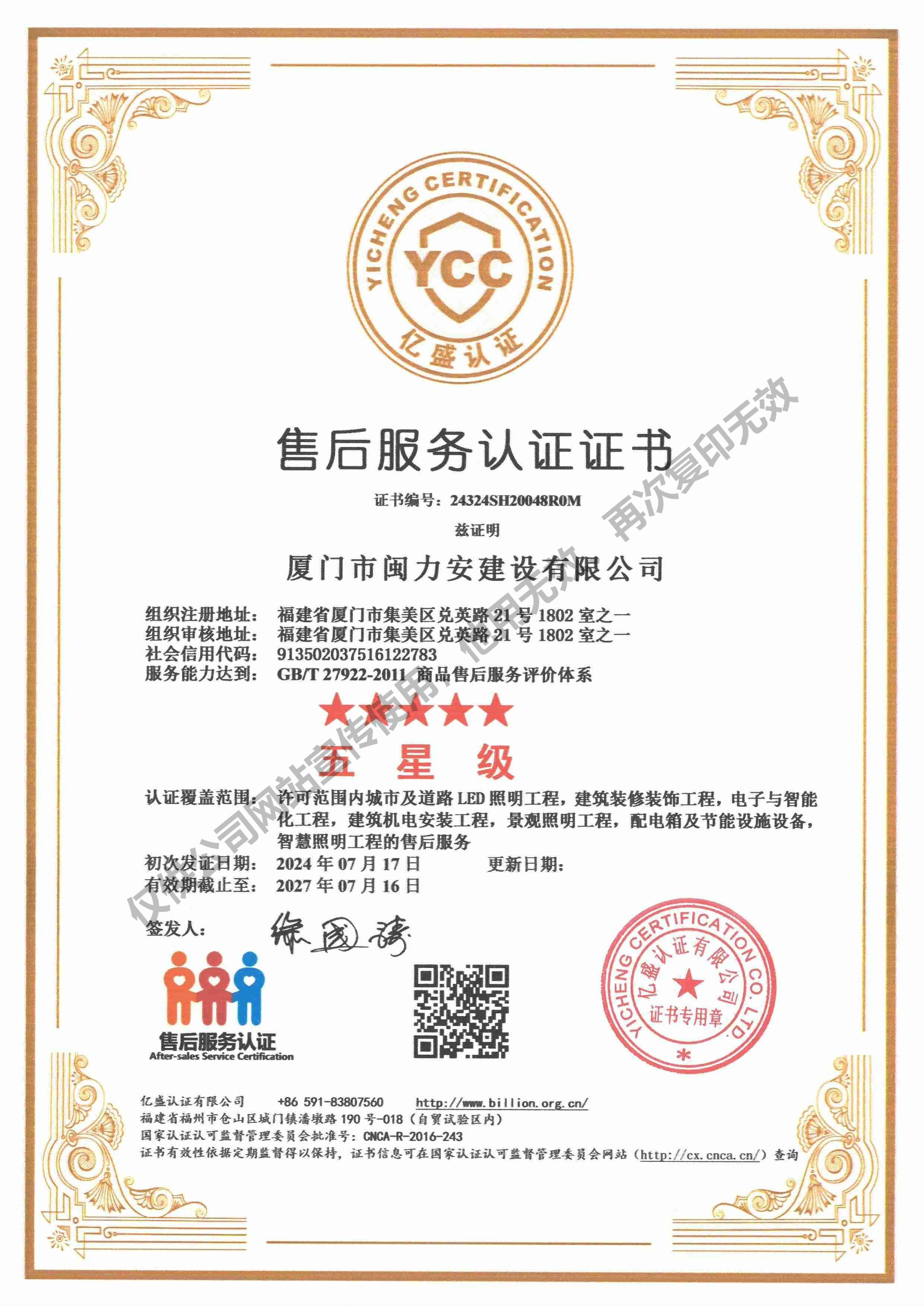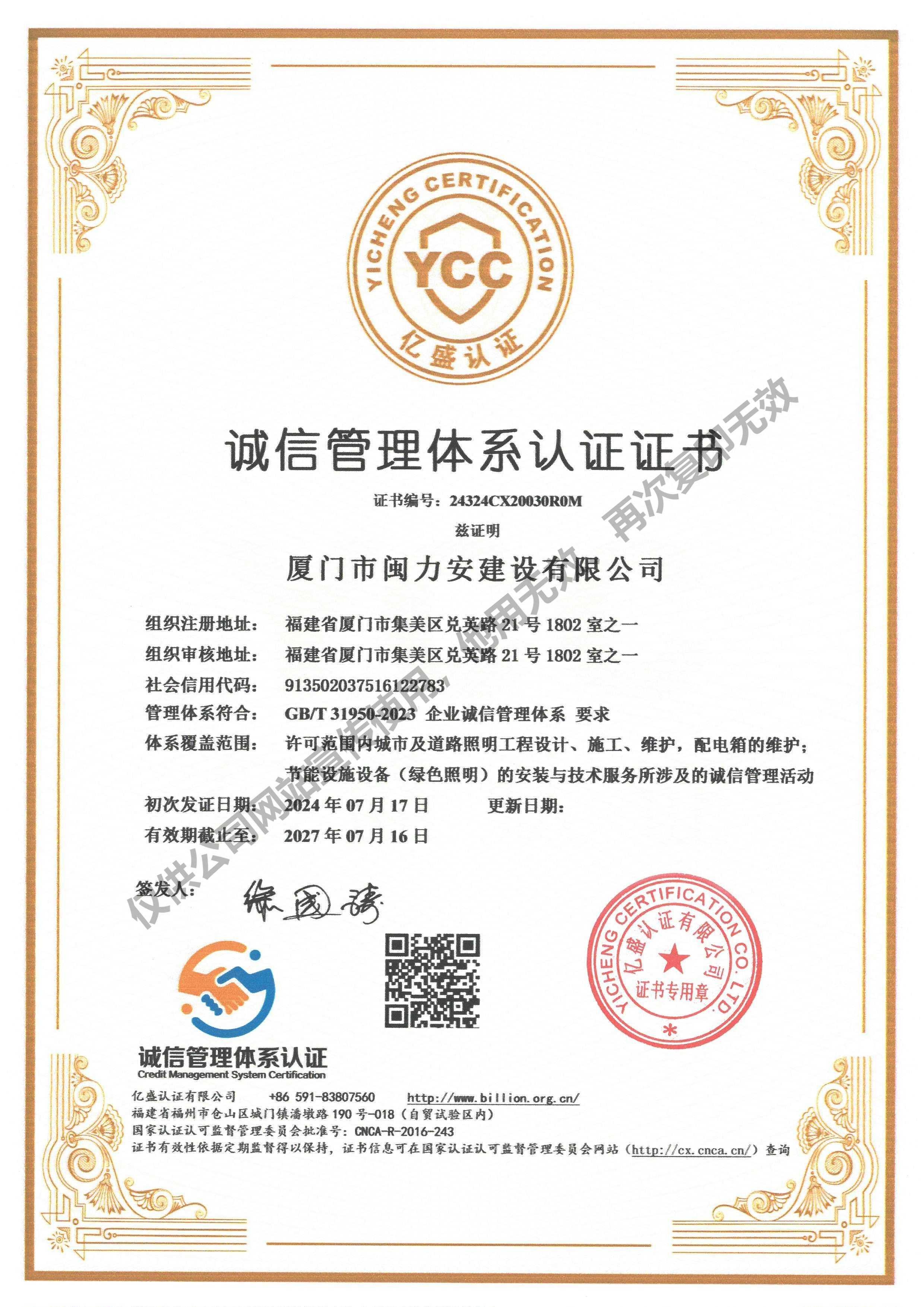 廈門市閩力安建設(shè)有限公司成立于2003年,公司取得市政公用工程施工總承包貳級、建筑裝修裝飾工程專業(yè)承包壹級、城市及道路照明工程專業(yè)承包壹級、電子與智能化工程專業(yè)承包貳級、消防設(shè)施工程專業(yè)承包貳級、電力工程施工總承包叁級、建筑機(jī)電安裝工程專業(yè)承包叁級、輸變電工程專業(yè)承包叁級、環(huán)保工程專業(yè)承包叁級、照明工程設(shè)計專項甲級、建筑裝飾工程設(shè)計乙級、施工勞務(wù)等資質(zhì)的綜合型企業(yè),公司于2013年通過了ISO9001質(zhì)量體系認(rèn)證,ISO14001環(huán)境管理體系認(rèn)證,OHSAS18001職業(yè)健康安全管理體系認(rèn)證。